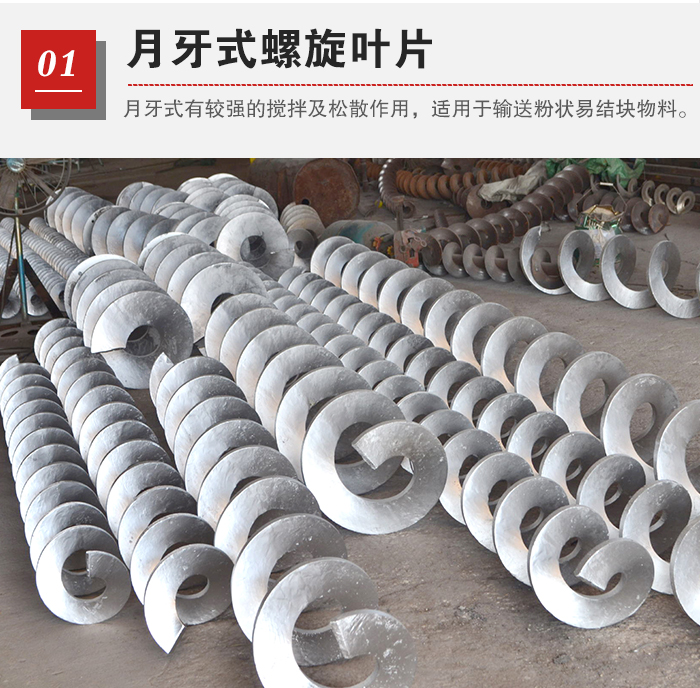 月牙式有较强的搅拌及松散作用,适用于输送粉状易结块物料。