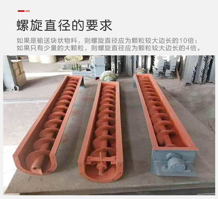 5.螺旋直径对于绞龙输送机的螺旋直径来讲,应满足的要求有:如果是输送块状物料,则螺旋直径应为颗粒较大边长的10倍;如果只有少量的大颗粒,则螺旋直径应为颗粒较大边长的4倍。