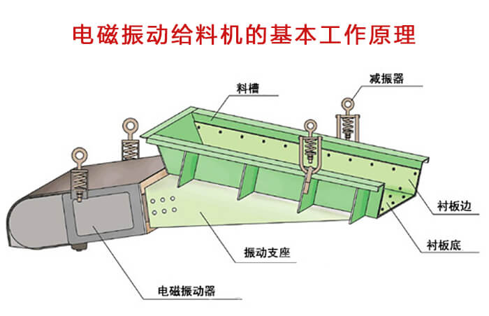 电磁振动给料机是一个较为完整的双质点定向强迫振动的弹性系统, 整个系统工作在低临界共振状态,主要利用电磁激振器驱动槽体以一定的倾角做往复振动,使物料沿槽移动。为电磁振动给料机的工作原理。