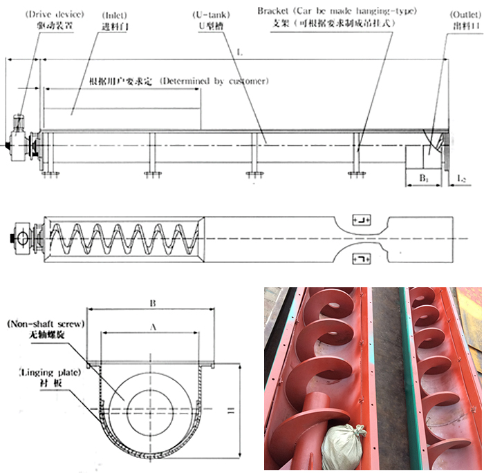 无轴螺旋绞龙输送机由无轴螺旋、U型槽、衬板、盖板、进出口和驱动装置组成。