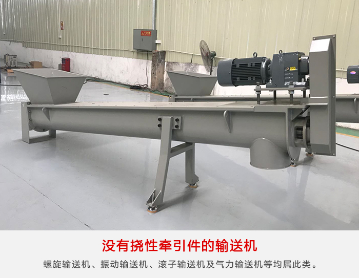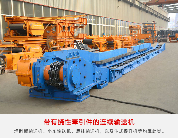 带式输送机、链板输送机、刮板输送机、埋刮板输送机、小车输送机、悬挂输送机,以及斗式提升机等均属此类。其工作特点是把物品置于承载件上,由挠性牵引件搬运承载件沿着固定的线路运动,靠物品和承载件的摩擦力使物品与牵引件在工作区段上一起移动。