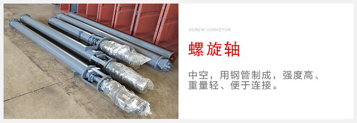 螺旋轴:中空,用钢管制成,强度高、重量轻、便于连接。在轴与轴的连接处和安装轴承处使用一小段实心轴。在连接处将实心轴伸入空心轴内用高强度的螺栓按相互垂直方向对穿空心轴与实心轴来固定连接螺旋轴。