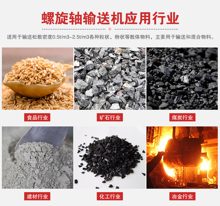 螺旋轴输送机适用于输送松散密度0.5t/m3~2.5t/m3各种粒状、粉状等散体物料,也可输送成件物品。在混凝土搅拌站、稳定土拌合站使用较为广泛,主要用于输送混凝土集料水泥及掺合料。