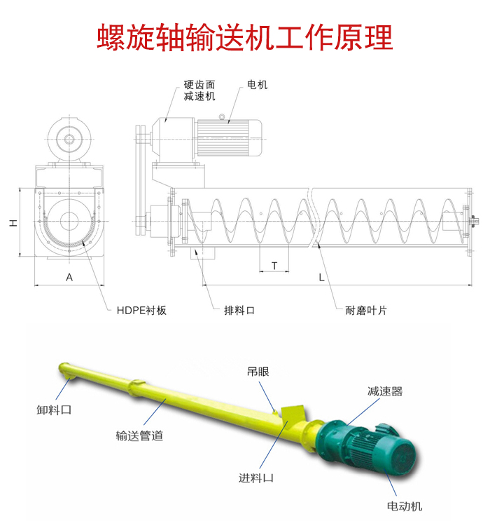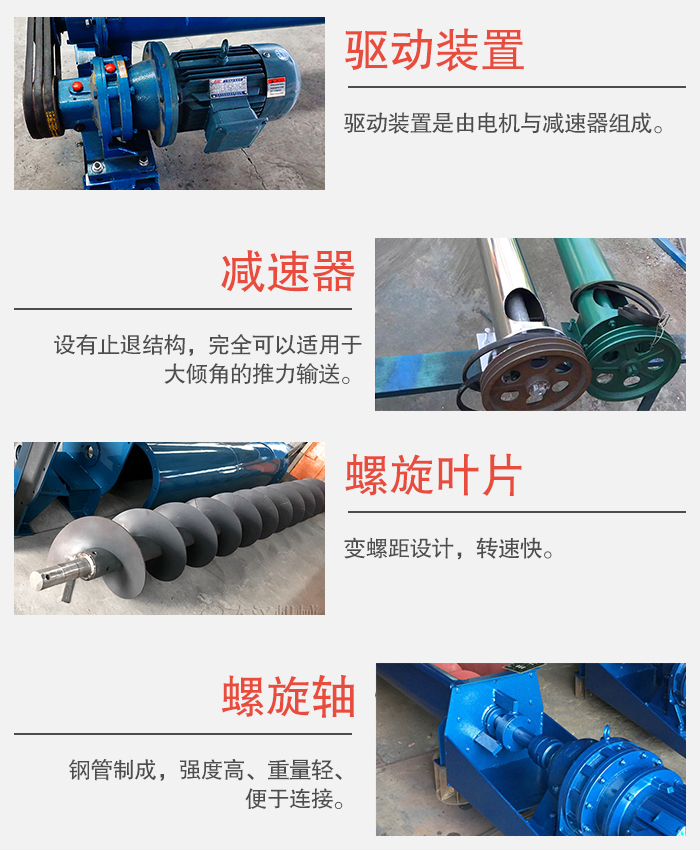 螺旋轴输送机主要由驱动装置,机壳、盖板、螺旋轴、螺旋叶片、进料口、出料口等部件组成。