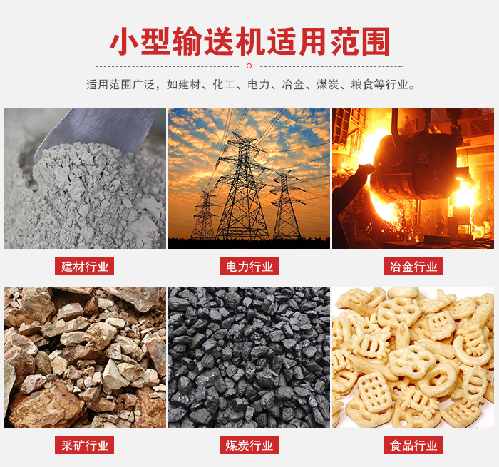 小型输送机适用范围广泛,如建材、化工、电力、冶金、煤炭、粮食等行业,适用于水平或倾斜输送粉状、粒状和小块状物料,如煤、灰、渣、水泥、粮食等。