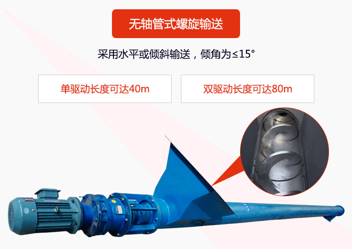 无轴管式午夜精品久久久久久久也叫管式无轴午夜精品久久久久久久,其外形为圆管式,可水平或倾斜输送,其倾角为≤15°,有双驱动和单驱动之分,单驱动螺旋机长度可达40m,双驱动螺旋机采用中间断开轴结构,长度可达80m。由于采用了无轴设计,可输送粘性强、易缠绕的物料,物料不易堵塞,排料口不堵塞。