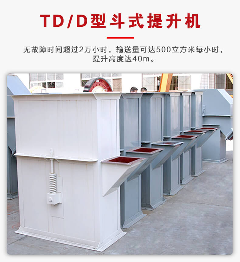 TD型斗式提升机由运行部分料斗与牵引胶带、带有传动滚筒的 上部区段,带有拉紧滚筒的下部区段,中间机壳,驱动装置,逆止制动装置等组成。无故障时间超过2万小时,输送量可达500m³/h,提升高度达40m。