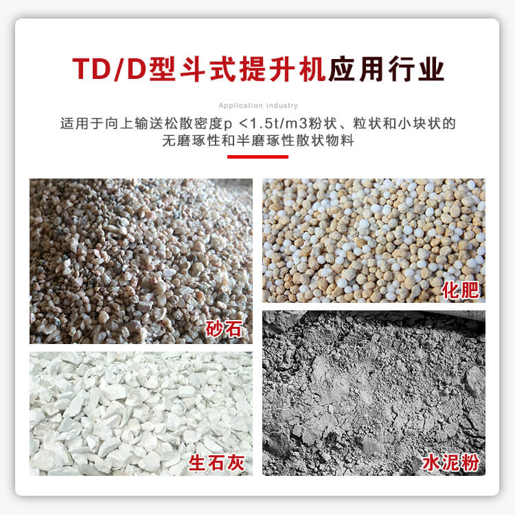 应用行业:TD型斗式提升机适用于向上输送松散密度p <1.5t/m3粉状、粒状和小块状的无磨琢性和半磨琢性散状物料 ,如煤、砂、焦末、水泥、碎矿石等。